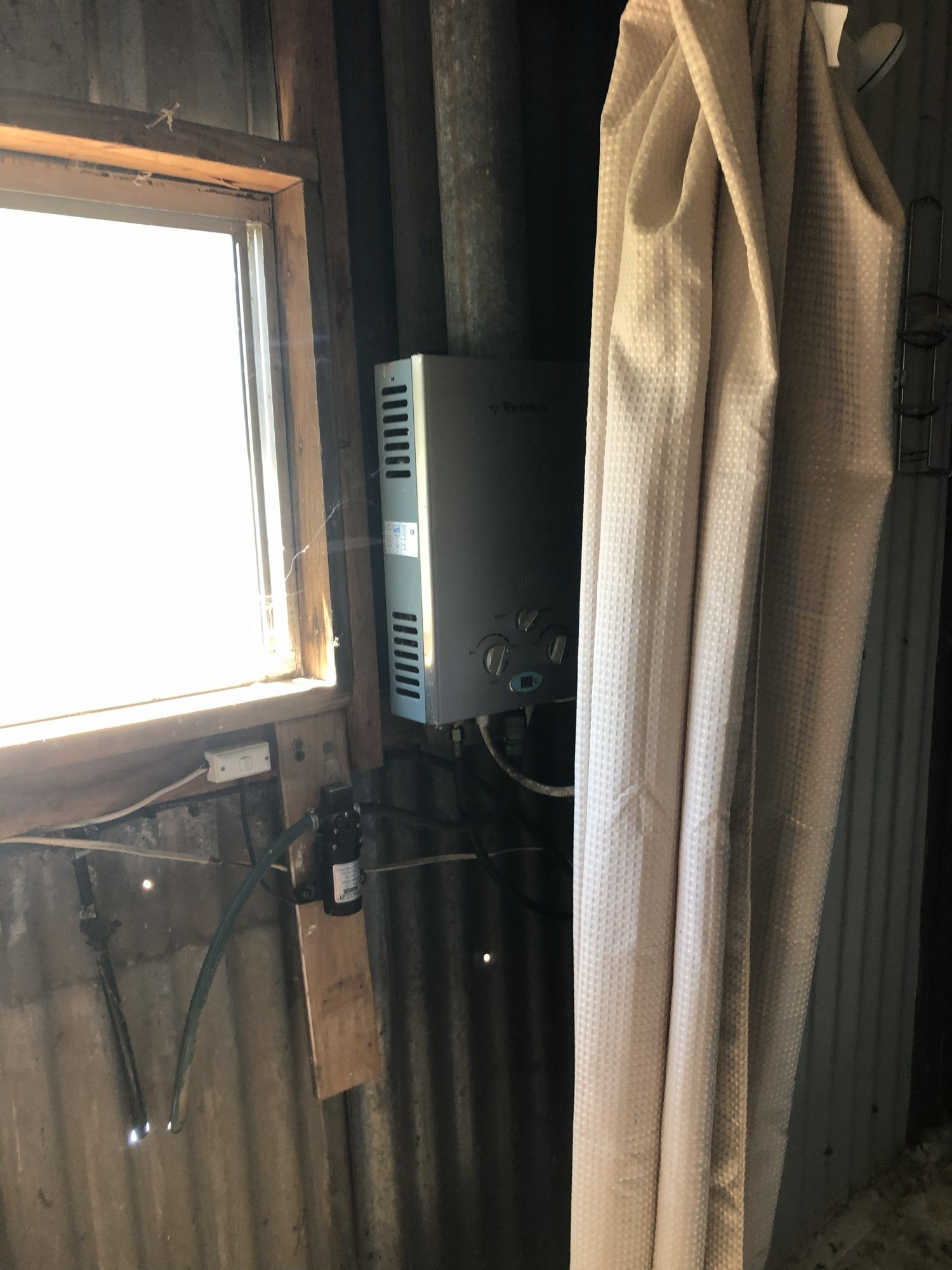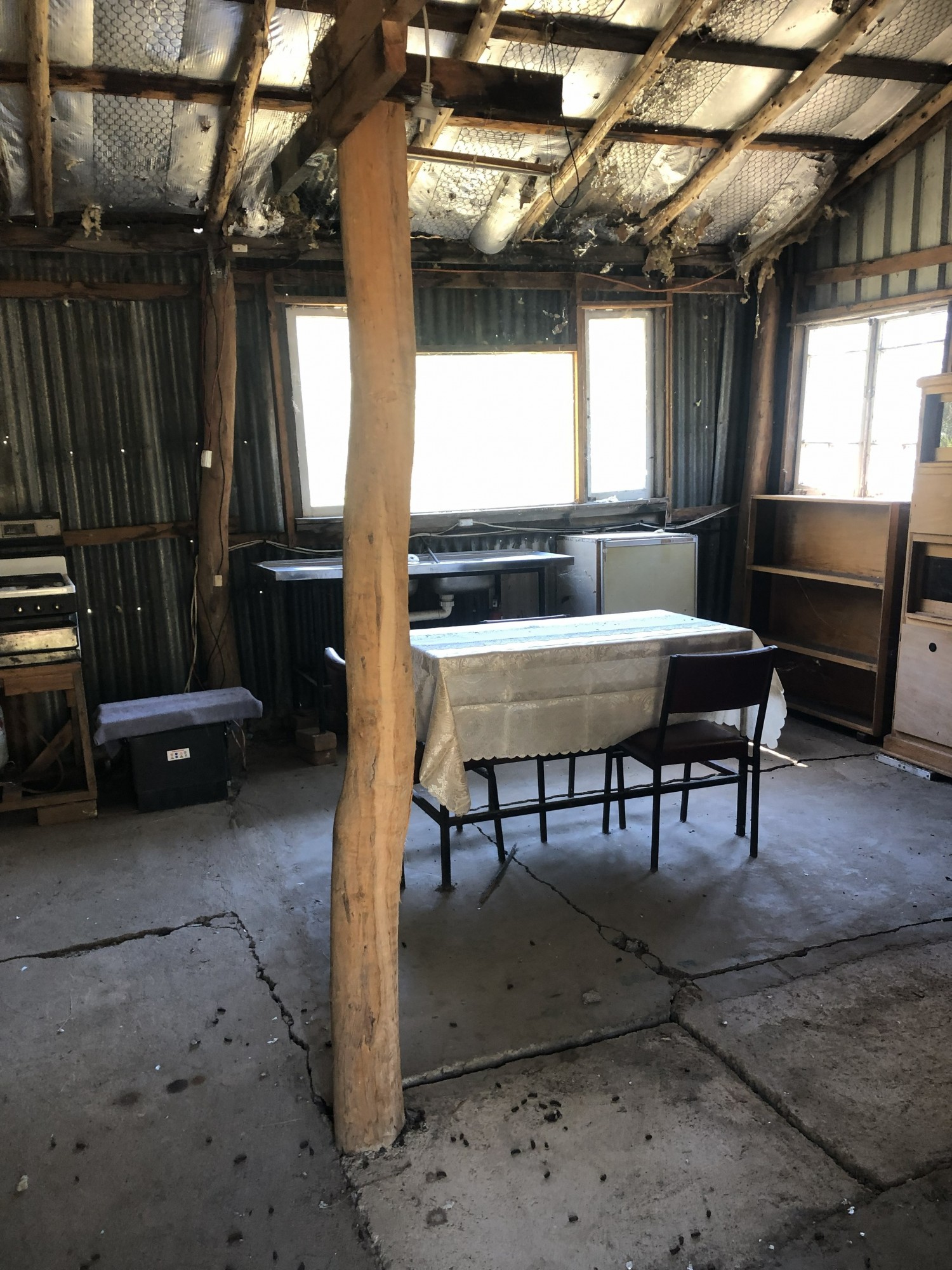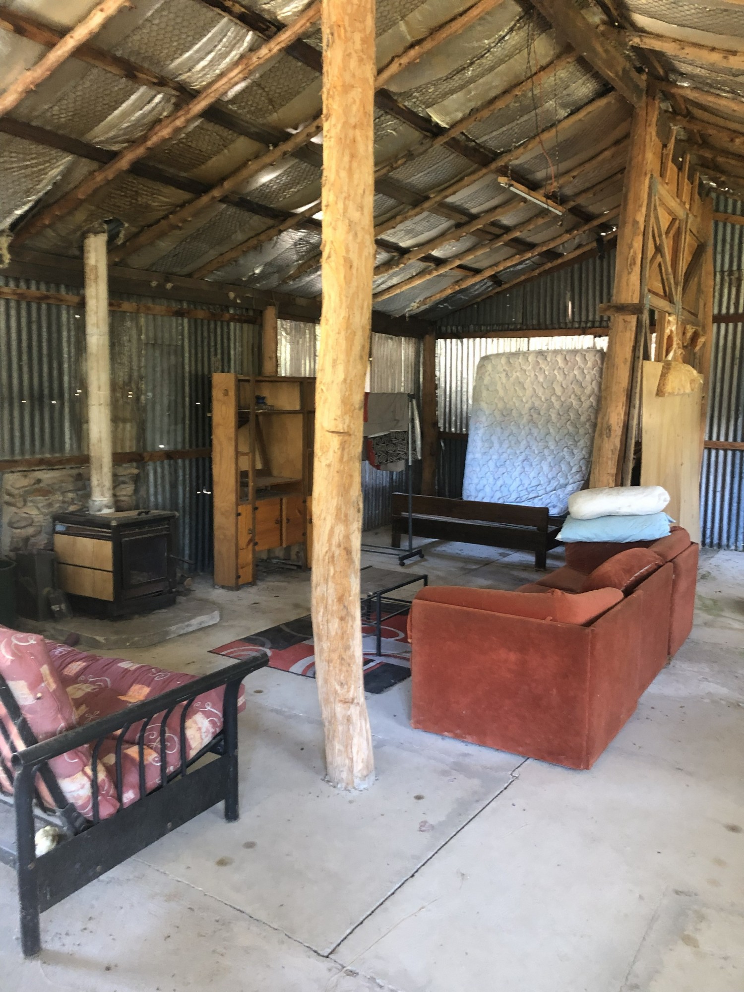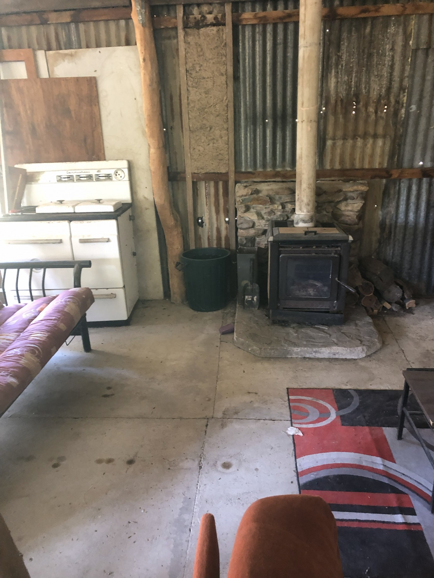 The cabin has a wood heater, both gas and slow combustion stoves, gas hot water and cement floor.