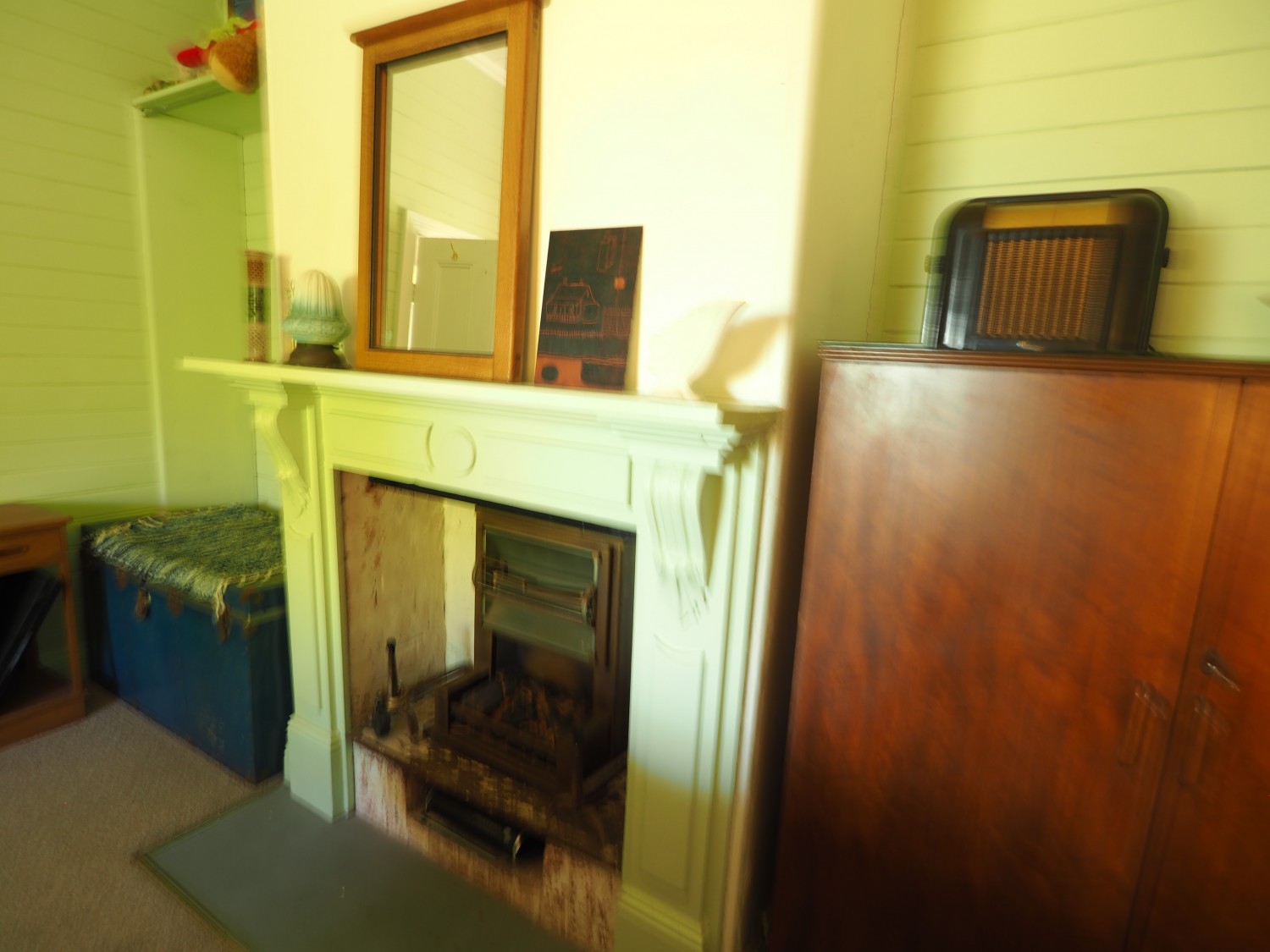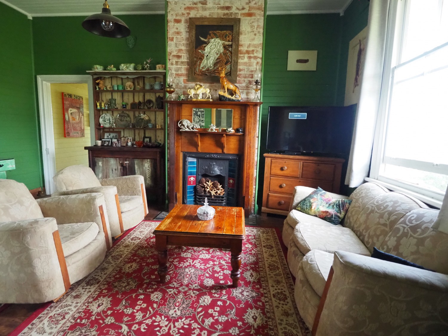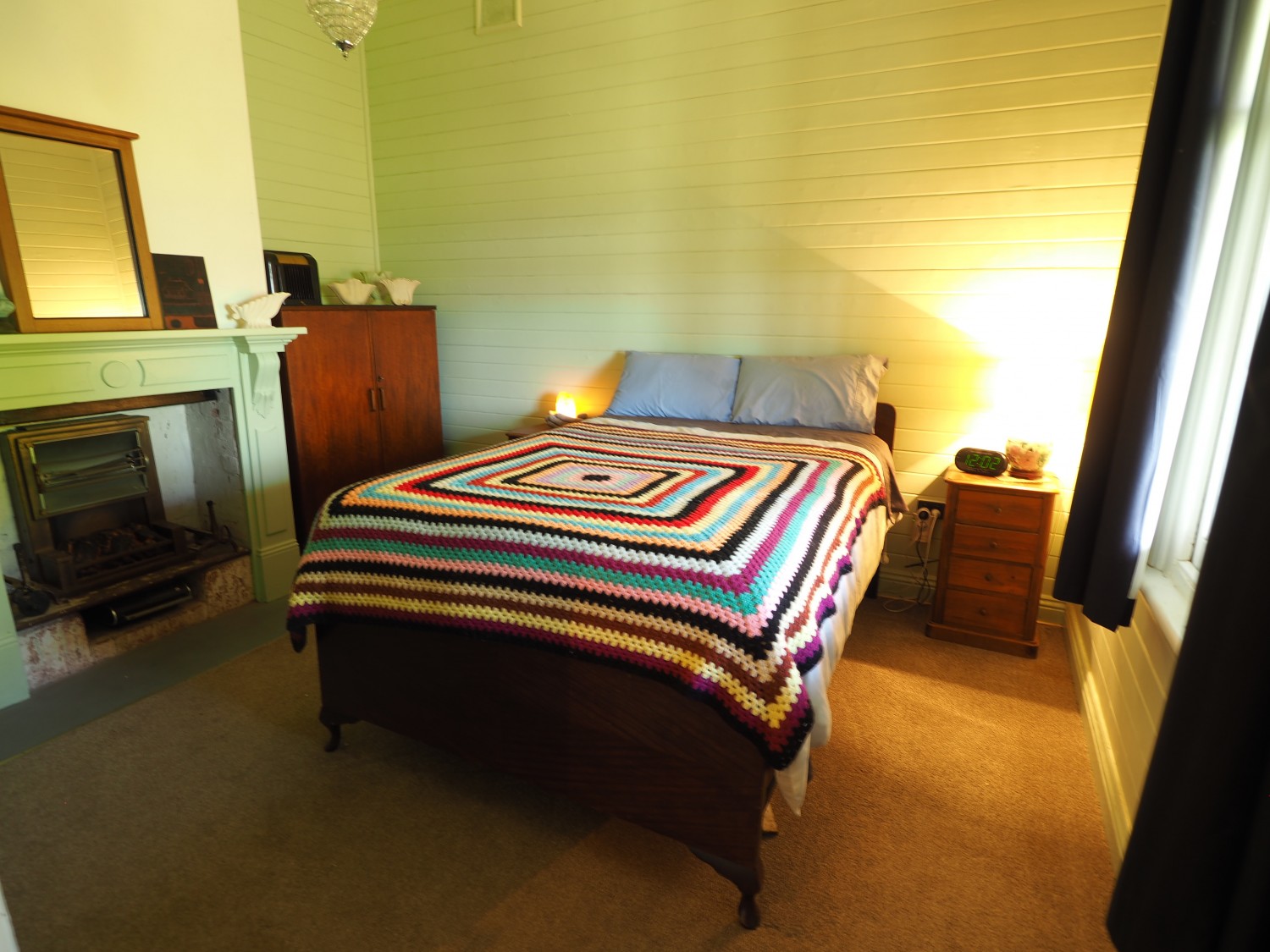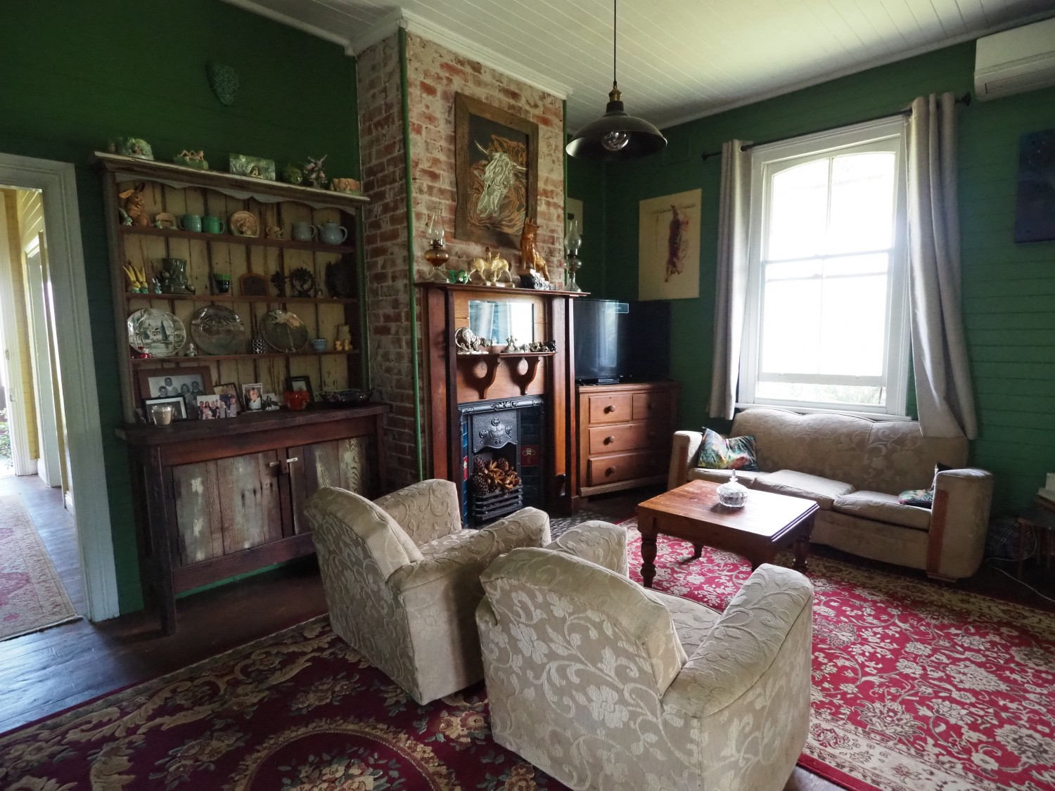 The cosy lounge room has a cast iron fire surround and wooden mantle as well as R/C air conditioner.